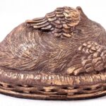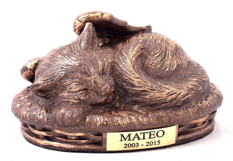 This Angelic Cat Urn is depicting a Kitty cozily sleeping in its warm basket bed. The Urn is made of “cold cast bronze” (polymer resin w/bronze filler) and hand-applied bronze patina. It comes with a felted bottom to protect furniture and is bottom-loaded with a 2″ snap-in security plug.