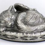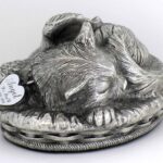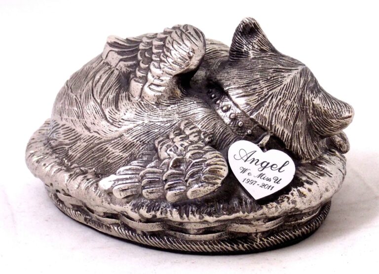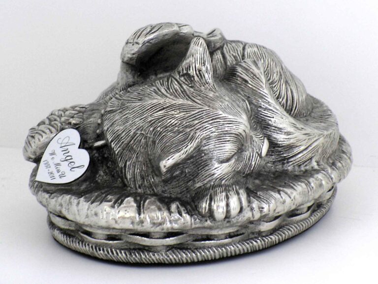 This Angelic Cat Urn is depicting a Kitty cozily sleeping in its warm basket bed. It is made of metal alloy and has a shiny Silver/Stainless Steel finish. The urn is bottom-loaded with a threaded security plug. The bottom is felted to protect the surface. Custom Engraved Heart-shaped Tag Also Available. Please select block font or script font.