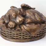 This Bronze Dog Urn is made of cold cast bronze (resin w/bronze filler) and hand applied bronze patina. The urn is bottom loaded with a felted bottom and a two inch snap-in security plug.