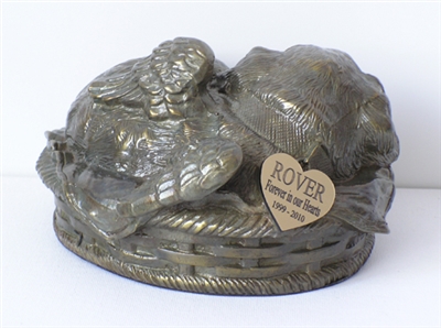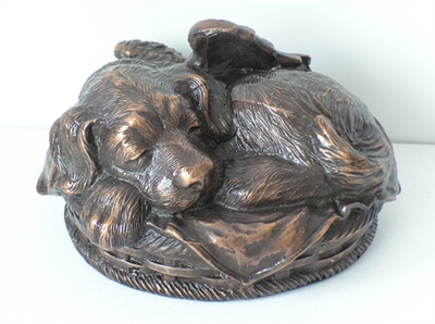 This Angelic Copper Dog Urn is made of heavy metal alloy wth a dark bronze/copper finish. The urn is bottom loaded with a felted bottom and a two inch snap-in security plug.