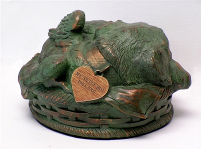 This Bronze Dog Urn made of cold cast bronze (resin w/bronze filler) and hand applied green patina. The urn is bottom loaded with a felted bottom and a two inch snap-in security plug.