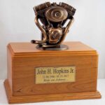 This Motorcycle Engine Urn is a perfect memorial for the motorcycle enthusiast. The cremation urn is made of solid American Cherry wood and features a highly detailed motorcycle engine sculpture. The engine is cast of resin with bronze pigment additive and hand finished with bronze patina. The removable bottom panel secures with included screws. Made in the USA.