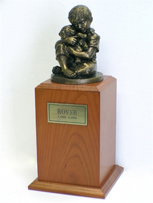 Artfully sculpted with great details figurine of a Boy with his Best Friend set on a solid Cherry Urn. Cast in cold bronze (resin w/bronze filler) and hand finished with bronze patina. This urn is bottom loaded and available in Cherry, Walnut or Red Oak.