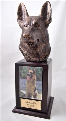 This German Shepherd Walnut Memorial Urn is featuring a beautifully crafted bust of a German Shepherd Dog set on a genuine Walnut Tower style wood urn. The sculpture is created by “cold cast bronze”(polymer with bronze additive) method and hand finished with bronze patina. The Urn is bottom loaded and secured with screws.