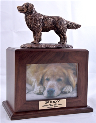 This Golden Retriever Walnut Picture Memorial Urn is featuring an artfully sculpted figurine of a Golden Retriever Dog set on a genuine Walnut wood urn. The figurine is created by “cold cast bronze”(polymer with bronze additive) method and hand finished with bronze patina. The Urn is bottom loaded and secured with screws.