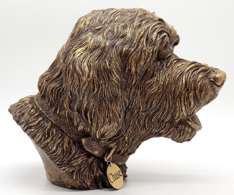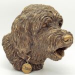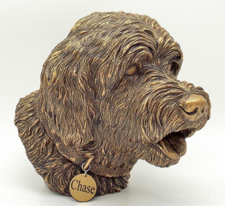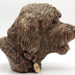 Witty, joyful, mischievous, always ready to play…. these are some qualities of this great family breed we tried to implement in our Golden/Labradoodle Dog Memorial Urn. Since these two breeds are very similar, we think this Memorial Urn will work for both, Goldendoodle and Labradoodle, or any other “doodle’ related breed. We paid a lot of attention to small details while working on this sculpture. The “Doodle” bust is created by the “cold-cast bronze” (polymer resin/bronze powder mixture) technique and is hand-finished with bronze patina. The urn can be easily opened from the bottom and secured with a 2″ threaded plug.