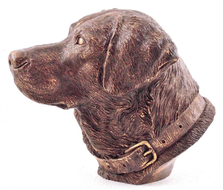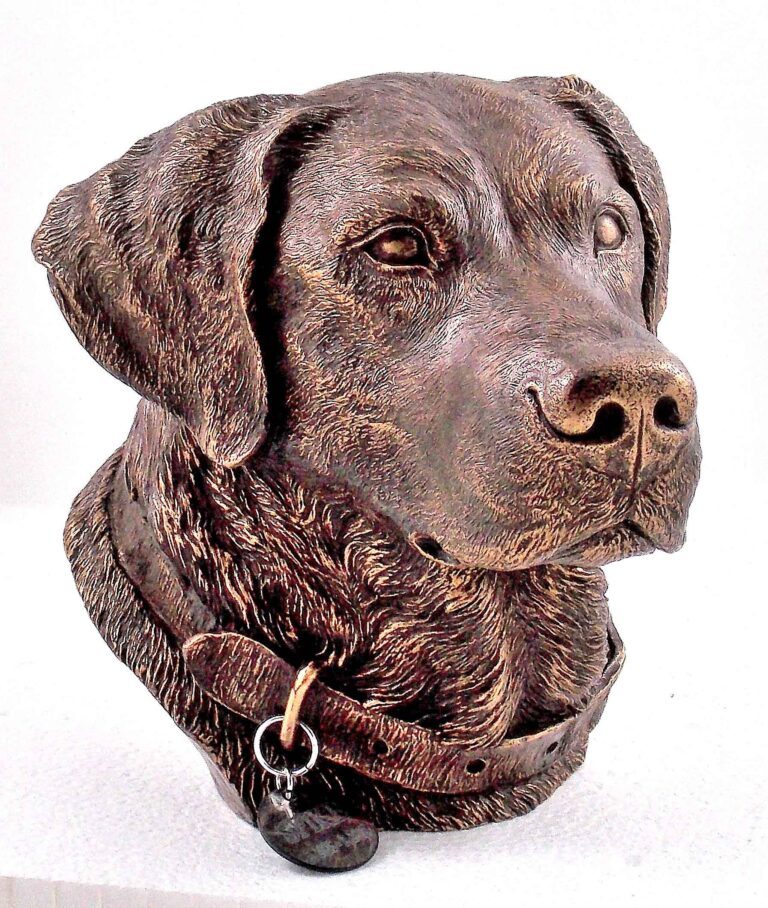 This highly detailed portrait of a Labrador Retriever Dog Urn was created by award winning American artist and will make a wonderful tribute to your beloved Lab. It is cast by “cold-cast bronze” (polymer resin/bronze powder mixture) technique and hand finished with bronze patina. The unique feature of this piece, that it is giving the customers a chance of using their existing Name Tag by attaching it to the Lab’s collar. A two jump-ring attachment is provided.