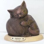 This Artistic quality Kitty Urn is cast of solid aluminum and hand finished with copper patina. The urn is bottom loaded with and comes with a custom designed maple display base.