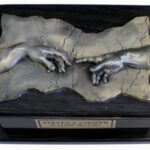 Inspired by Michelangelo’s design design beautifully cast pewter plaque placed on top of a Black Marble Urn.Custom Engraving Also Available. Select block font or script font.