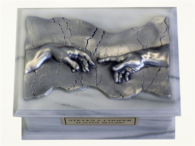 Inspired by Michelangelo’s design beautifully sculpted and cast pewter plaque on top of a White Marble Urn.