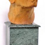 This portrait of a Yellow Labrador Retriever Dog was carved by hand of hard Maple wood and set on a beautiful Green marble memorial urn. Photographs for the sculpture were provided by the customer.